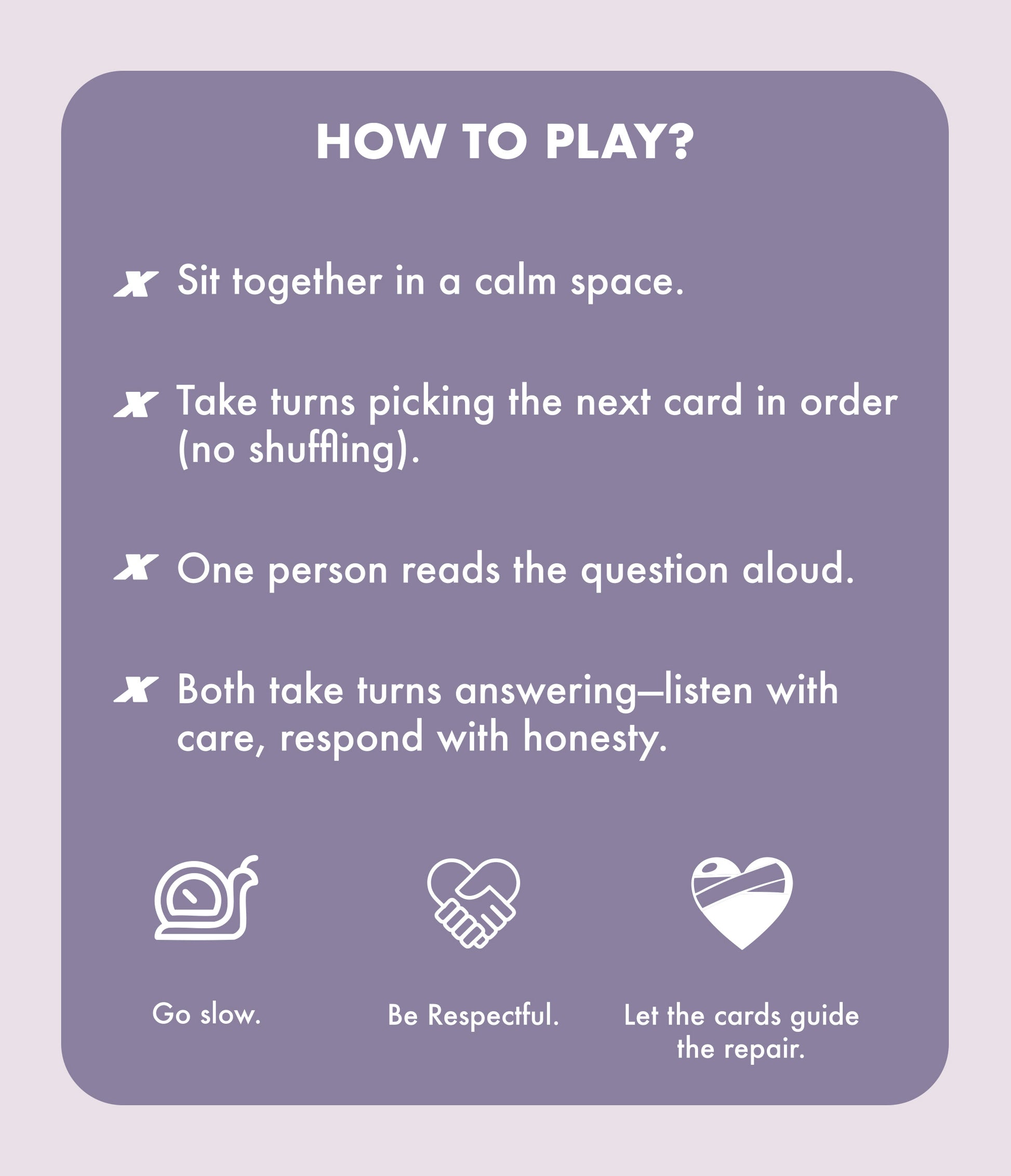 Each player takes turns picking a card chronologically and answering questions that follow the MIS method—Moment, Interpretation, Solution. These help both players unpack what happened, how it felt, and how to move forward.